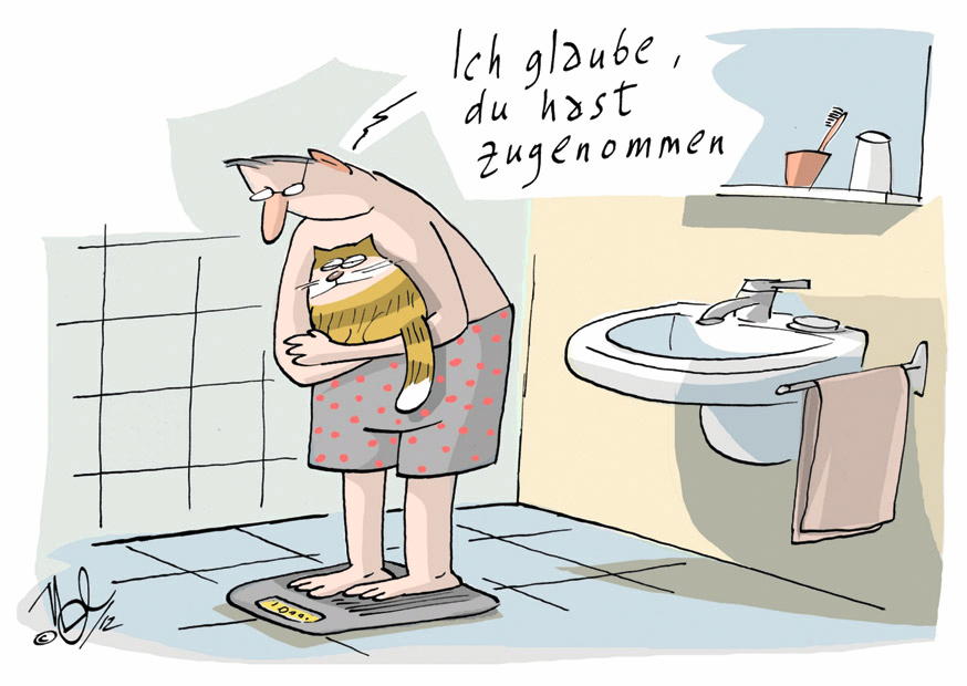 Ein Mann mit einer Katze in den Armen steht auf einer Badezimmerwaage. Er scheint besorgt über seine Gewichtsveränderung zu sein. Es ist ein humorvoller Moment.