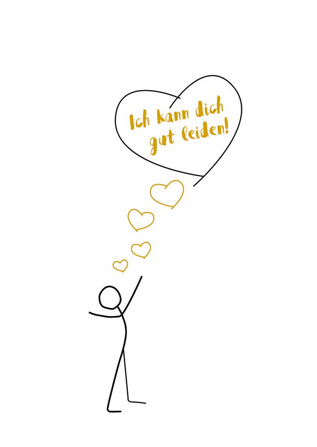 Ein Strichmännchen hält ein Herz über den Kopf und zeigt damit seine Zuneigung. In der Sprechblase steht der Satz Ich kann dich gut leiden, der Freundschaft suggeriert.