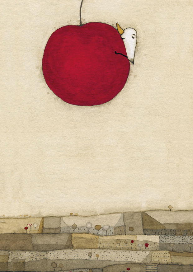 Ein kleiner Vogel sitzt an einem großen roten Apfel, der hoch über einer kargen Landschaft schwebt. Die Umgebung ist einfach und friedlich gestaltet.