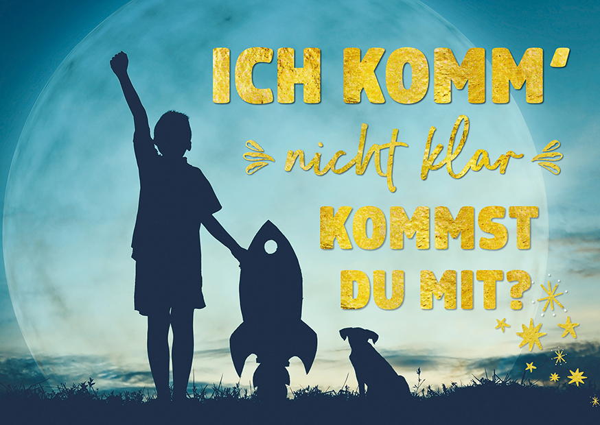Ein Kind steht mit einer Rakete in der Hand neben einem Hund und blickt zum Mond. Die Nacht ist klar, und die Szenerie strahlt Abenteuerlust und Fantasie aus.