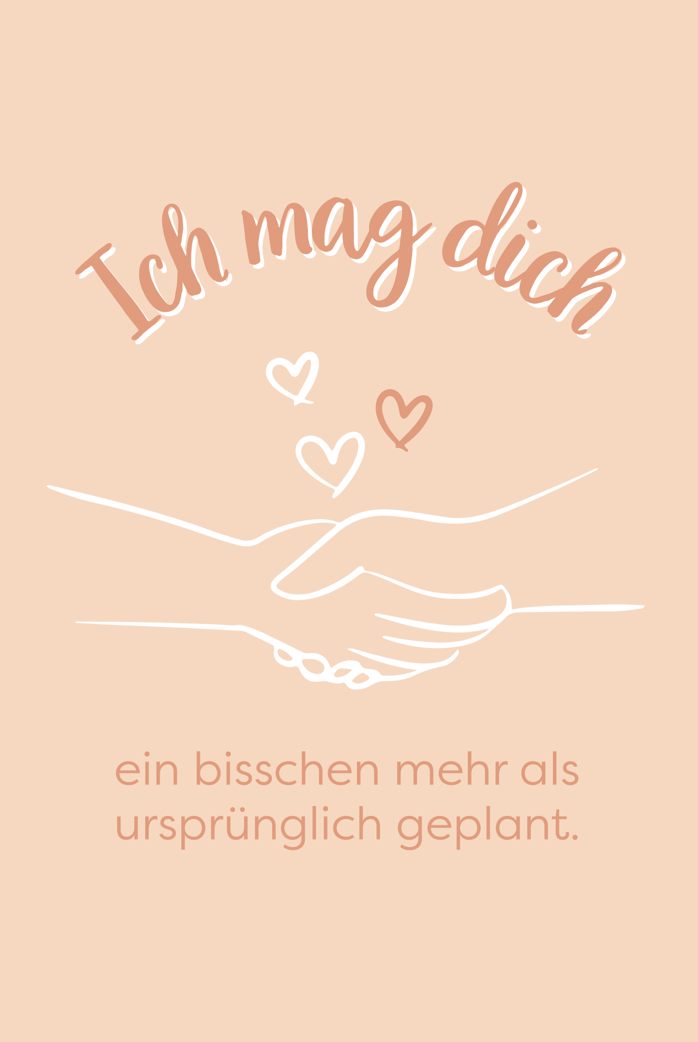Die Hände zweier Personen sind ineinander verschlungen, während ein verspielter Text über Zuneigung und unerwartete Gefühle druckt. Die Farben sind sanft und einladend.