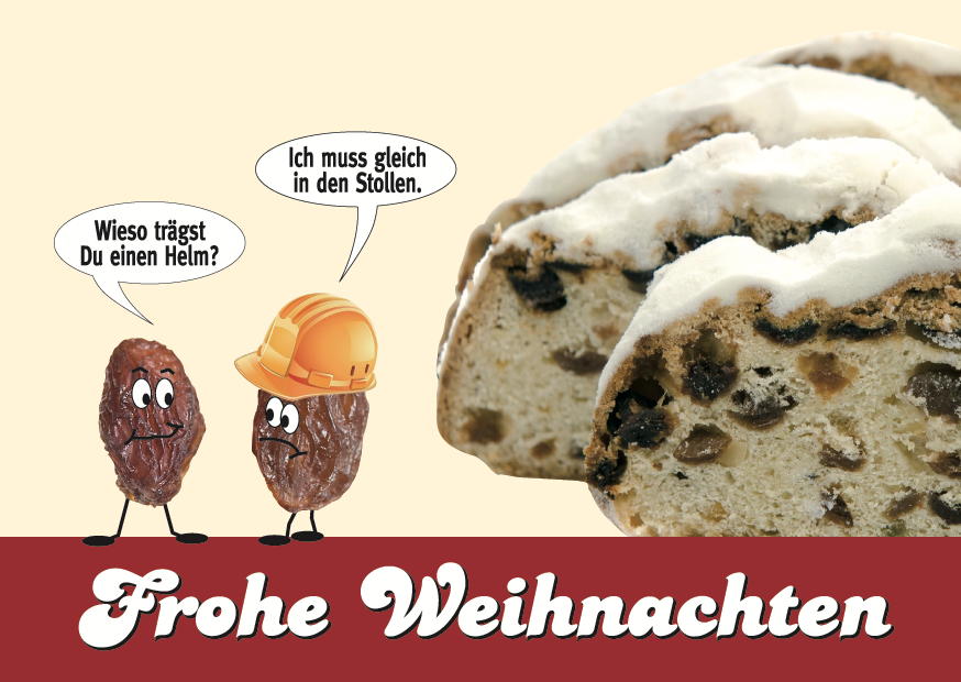 Zwei lustige Figuren unterhalten sich über einen Stollen, während einer von ihnen einen Helm trägt. Die Weihnachtsstimmung ist spürbar.