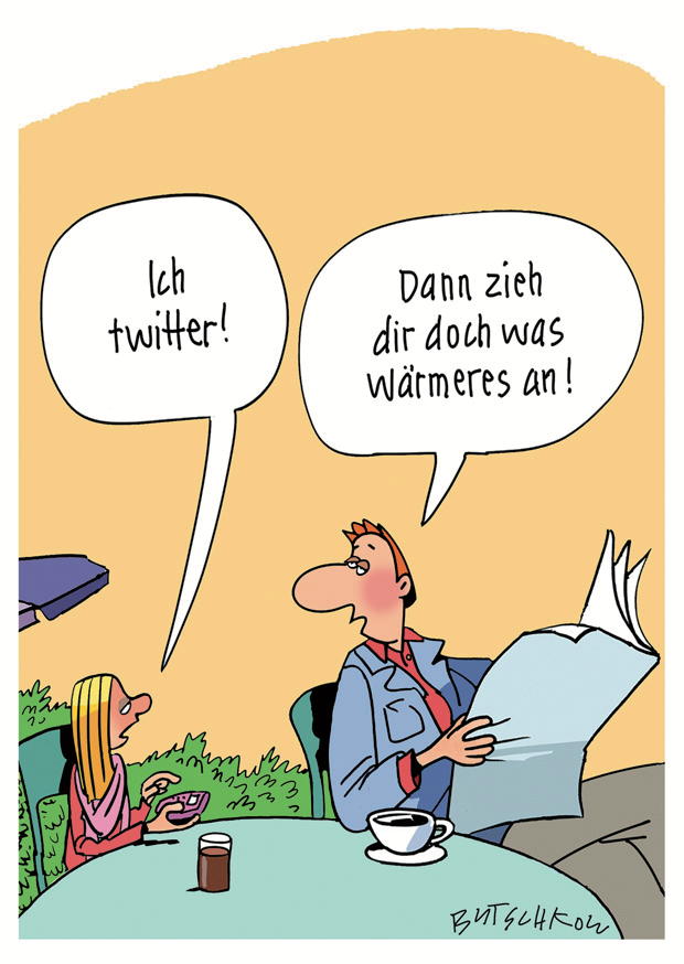 Ein Mann liest in einem Café und antwortet einem Mädchen, das sagt, dass es twittern will. Beide genießen einen entspannten Moment bei Kaffee und Kuchen.