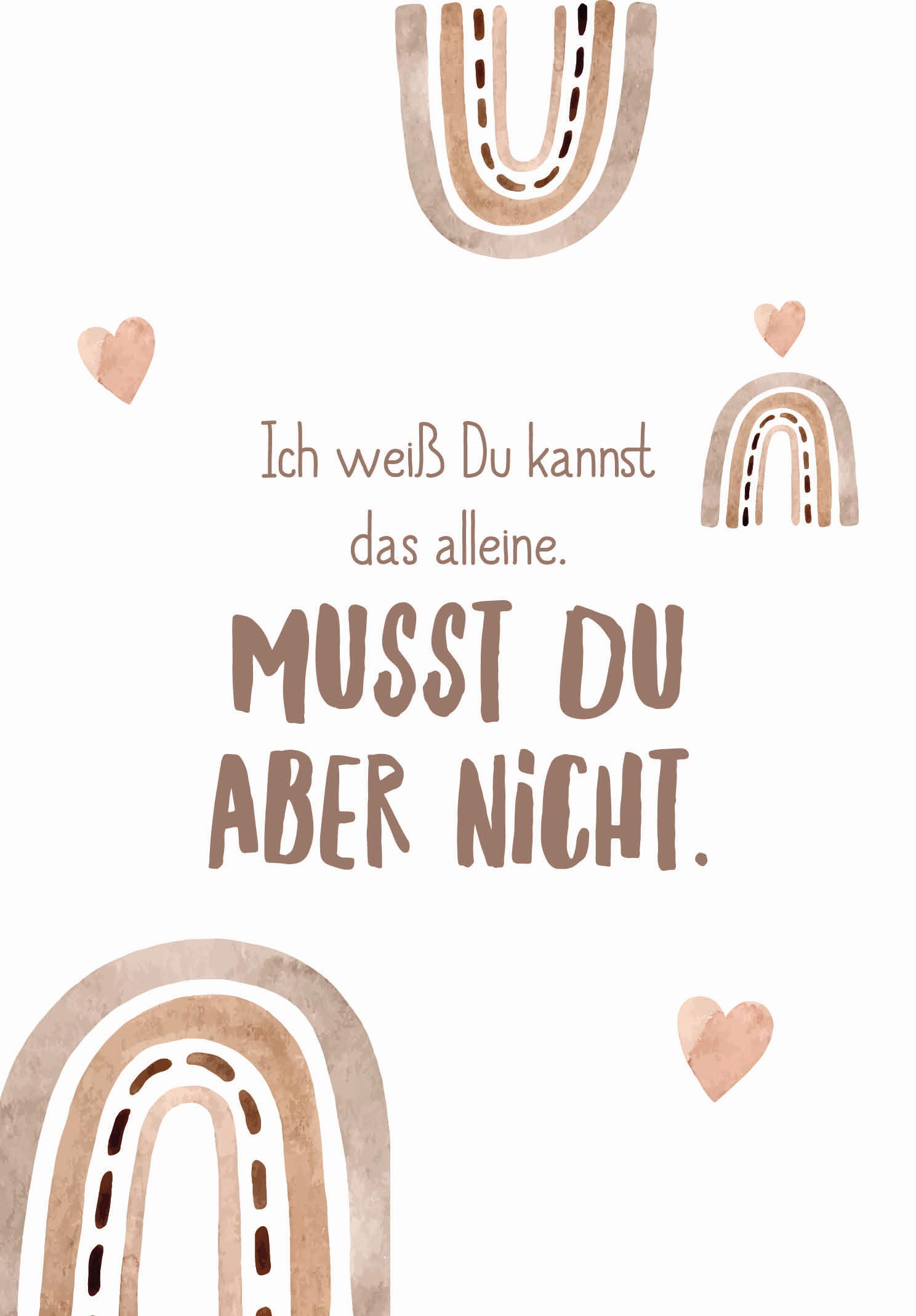 Eine inspirierende Botschaft auf hellem Hintergrund zeigt niedliche Regenbogen und Herzen, die zur Unterstützung und Ermutigung einladen.