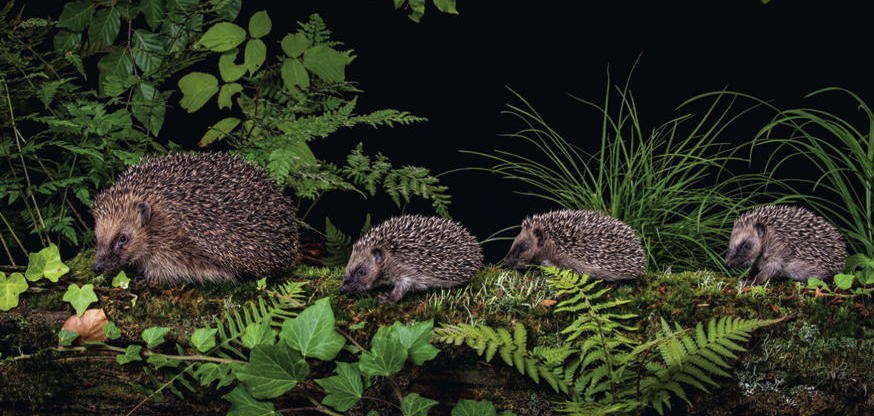 In einem üppigen Wald bewegen sich vier Igel vorsichtig über eine Baumstammfläche, umgeben von grünen Pflanzen und Moos. Die Dämmerung verstärkt die ruhige Atmosphäre.