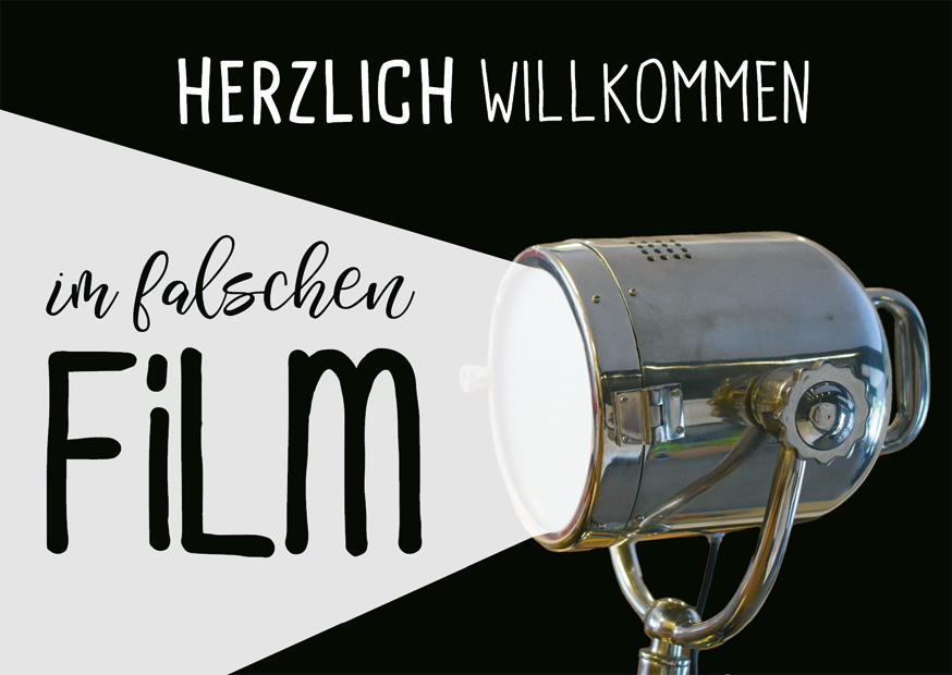 Das Bild zeigt ein nostalgisches Spotlicht, das auf den Schriftzug „Herzlich willkommen im falschen Film“ strahlt. Der Kontrast von Schwarz und Chrom sorgt für einen modernen Eindruck.