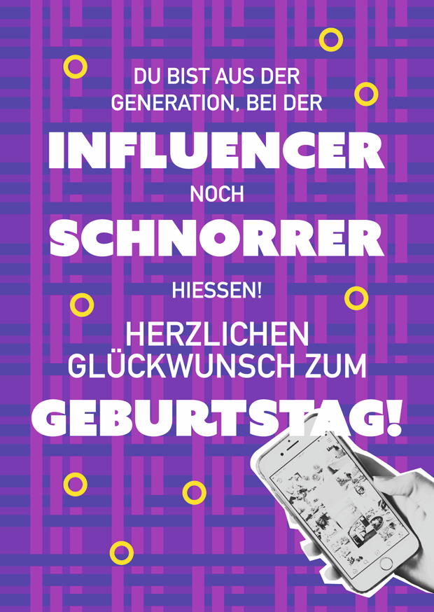 Ein lebhaftes Geburtstagsgrußmotiv, das die Generation der Influencer und Schnorrer feiert, mit bunten Grafiken und einem klaren, freundlichen Schriftzug.