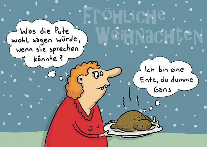 Eine Frau in einem roten Kleid fragt sich, was die Pute sagen würde, wenn sie sprechen könnte. Auf dem Tisch liegt eine gebratene Ente..