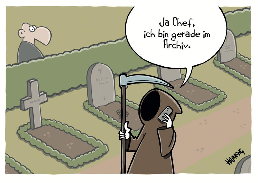 Der Sensenmann steht auf einem Friedhof und spricht am Handy mit seinem Chef über Archive, während eine Person im Hintergrund zusieht.