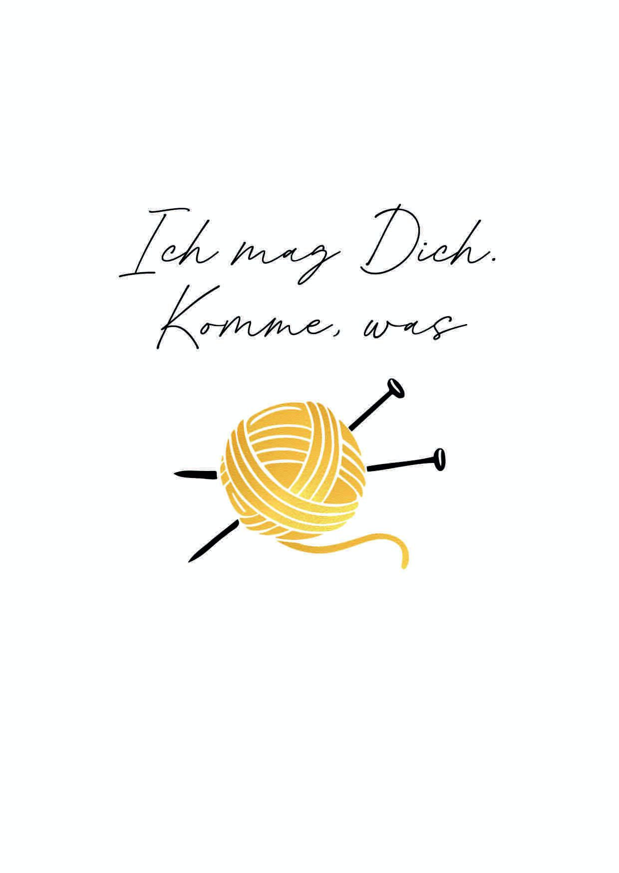 Eine motivierende Botschaft hervorgehoben von einem Knäuel gelber Wolle und zwei Stricknadeln. Diese witzige Darstellung vermittelt Freude und Unterstützung in kreativen Projekten.