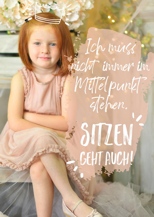 Ein Mädchen mit leuchtend roten Haaren sitzt in einem festlich dekorierten Raum, lächelt und trägt eine elegante Krone. Sie genießt den Moment in ihrem schönen Kleid.