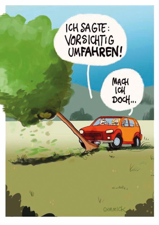 Ein rotes Auto fährt dicht an einem Baum vorbei, während der Beifahrer frustriert warnt. Die landschaftliche Kulisse besteht aus Wiesen und einigen Bäumen unter einem blauen Himmel.