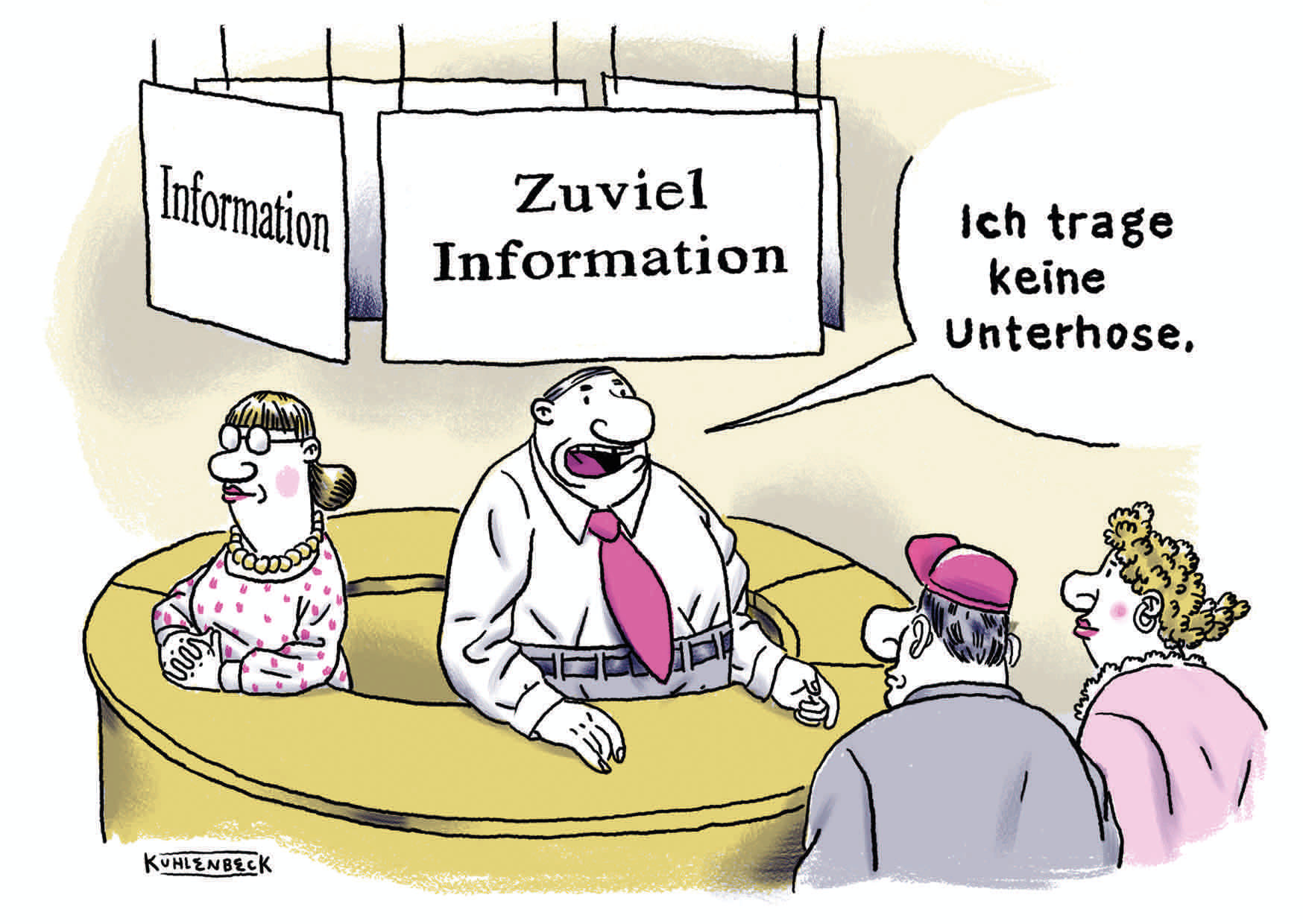 Ein humorvoller Moment am Informationsschalter, wo ein Besucher über seine Unterwäsche spricht. Die andere Person wirkt verwirrt, während Zuschauer aufmerksam zuhören.