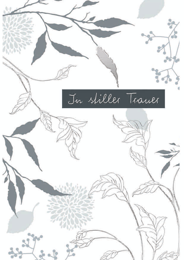 Eine kreative Trauerkarte zeigt zarte florale Illustrationen in Grautönen, ergänzt durch den Schriftzug „In stiller Trauer“ in der Mitte.