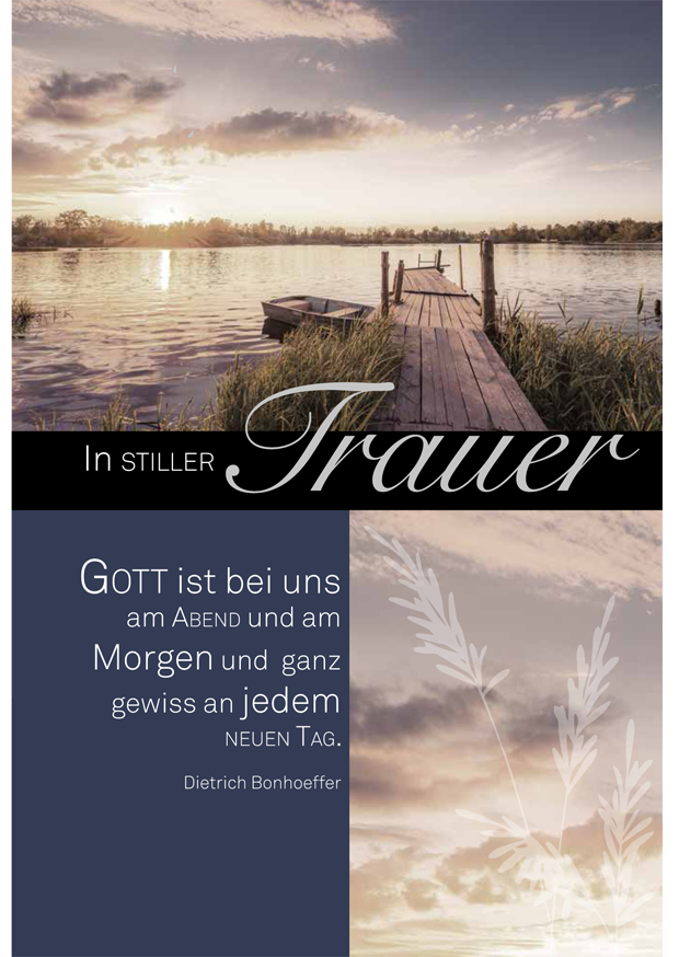 Der Steg erstreckt sich ruhig über das Wasser bei Sonnenuntergang, begleitet von aufmunternden Worten für Trauernde und einem Bezug zu Gott.