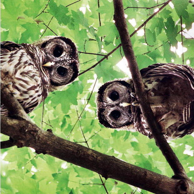 Zwei Eulen blicken von einem Ast aus neugierig nach unten. Das Licht spielt durch die grünen Blätter und schafft eine friedliche Atmosphäre.