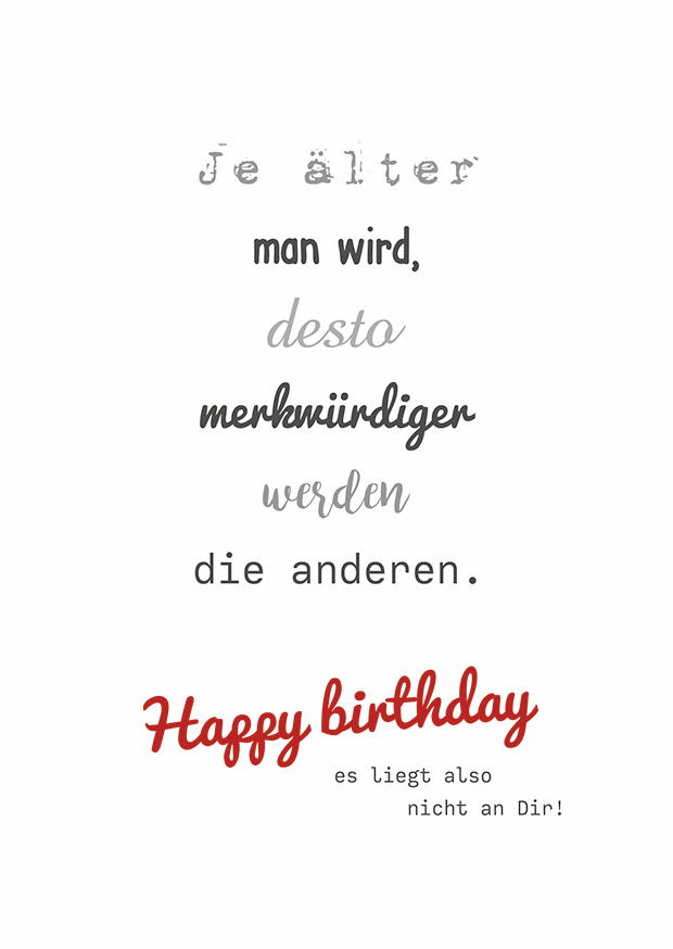 Eine originelle Grußkarte zum Geburtstag, die mit einem humorvollen Spruch über das Altern und die Wahrnehmung von anderen gestaltet ist. Ideal für besondere Anlässe.