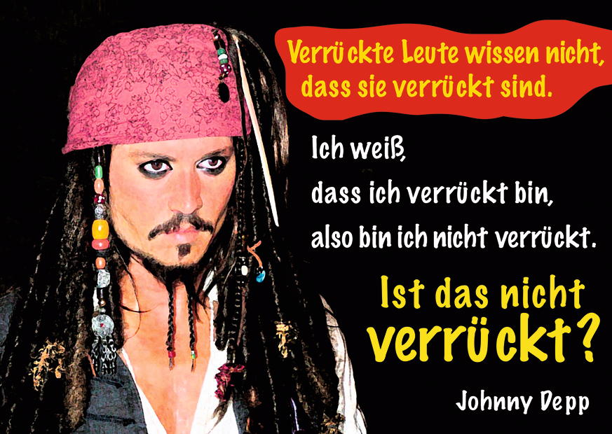 In einem kreativen Porträt wird Johnny Depp als Pirat dargestellt, umgeben von bunten Accessoires und einem farbenfrohen Hintergrund, während er über Verrücktheit spricht.
