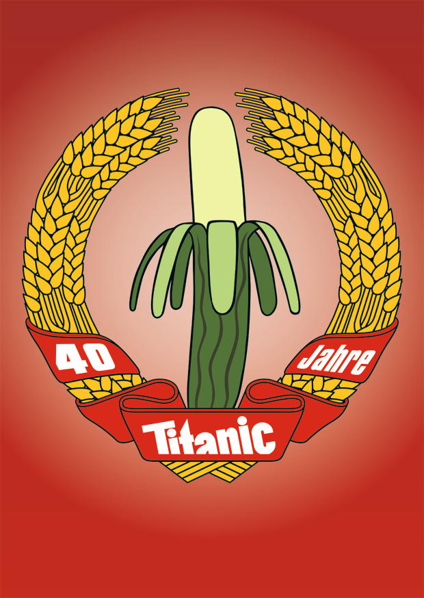 Bei der Jubiläumsfeier zur Titanic werden 40 Jahre gefeiert. Ein emblematisches Design zeigt Weizenähren und eine grüne Gurke im Zentrum der Festlichkeiten.
