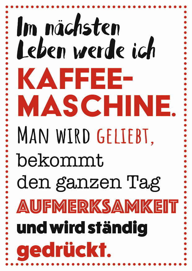 Die Idee faszinierender Träume zeigt, dass das Leben einer Kaffeemaschine voller Liebe und ständiger Aufmerksamkeit ist. Ein humorvoller Wunsch für das nächste Leben.