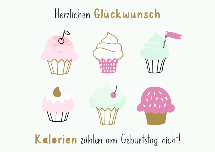 Bunte und fröhliche Cupcakes sind liebevoll dargestellt. Der Text gratuliert zum Geburtstag und hebt hervor, dass Kalorien an diesem besonderen Tag unwichtig sind.