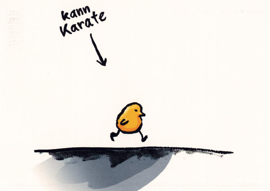 Ein kleiner, gelber Vogel läuft fröhlich über den Boden. Über ihm steht der humorvolle Text, dass er Karate kann, was die Szene amüsant macht und zum Schmunzeln anregt.