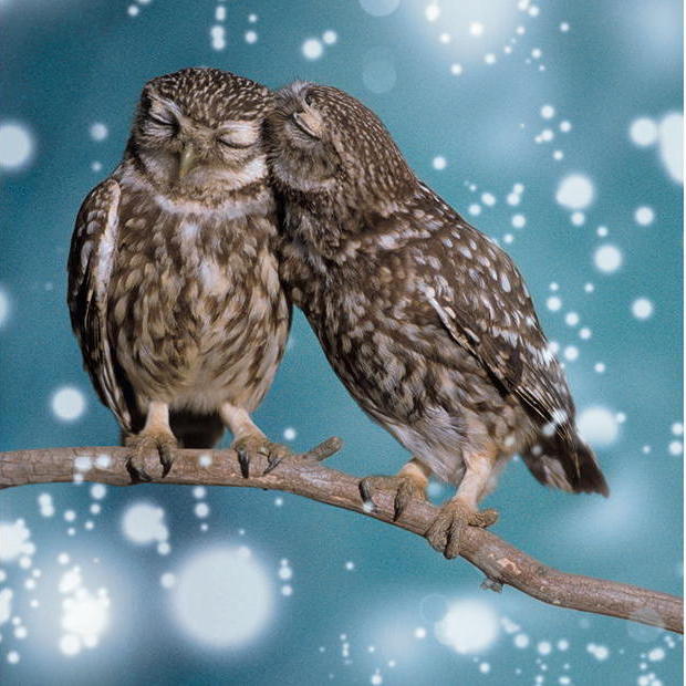 Zwei Eulen sitzen eng beieinander auf einem Ast und zeigen ihre Zuneigung durch sanftes Kuscheln, während ein blauer Hintergrund für eine ruhige Atmosphäre sorgt.