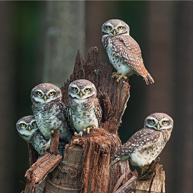 Fünf kleine Eulen sitzen harmonisch auf einem alten Baumstumpf in einem stillen Wald. Ihr auffälliger Blick spezifiziert die Umgebung, in der sie leben.