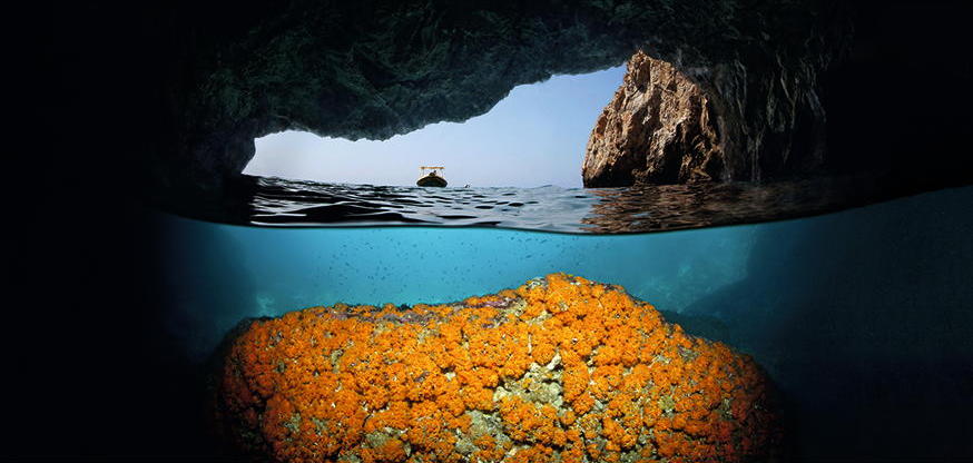 Unterwasser entfaltet sich ein lebendiges Ökosystem mit leuchtenden, orangefarbenen Korallen. Ein Boot ist im Hintergrund sichtbar, während Sonnenlicht auf die Wasseroberfläche trifft.
