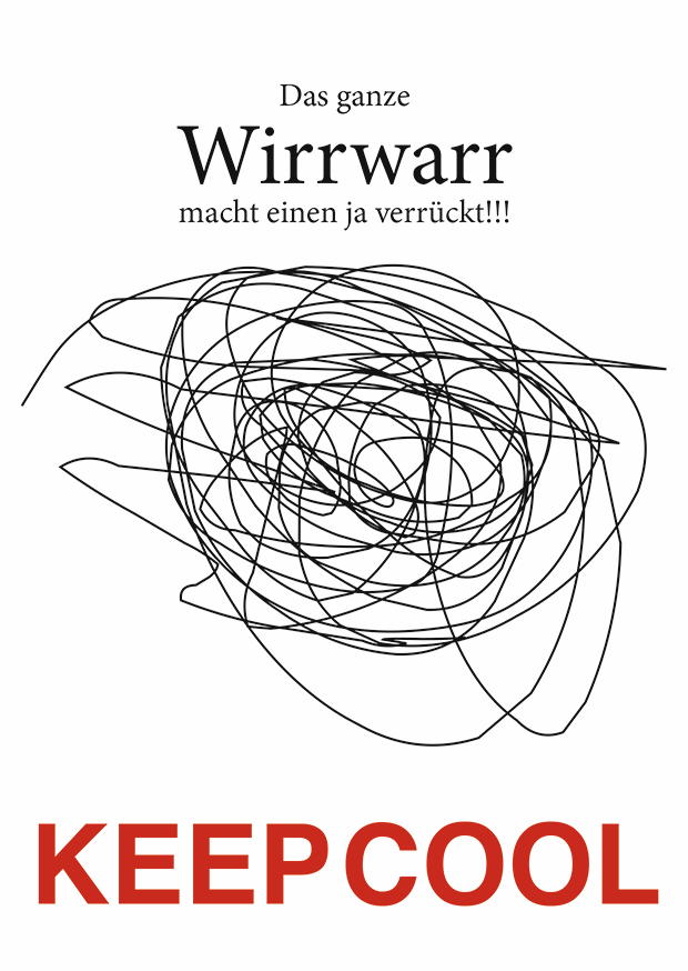 Dieses Kunstwerk zeigt verworrene Linien, die ein Gefühl von Chaos und Verwirrung vermitteln, während die Botschaft zur inneren Ruhe aufruft.