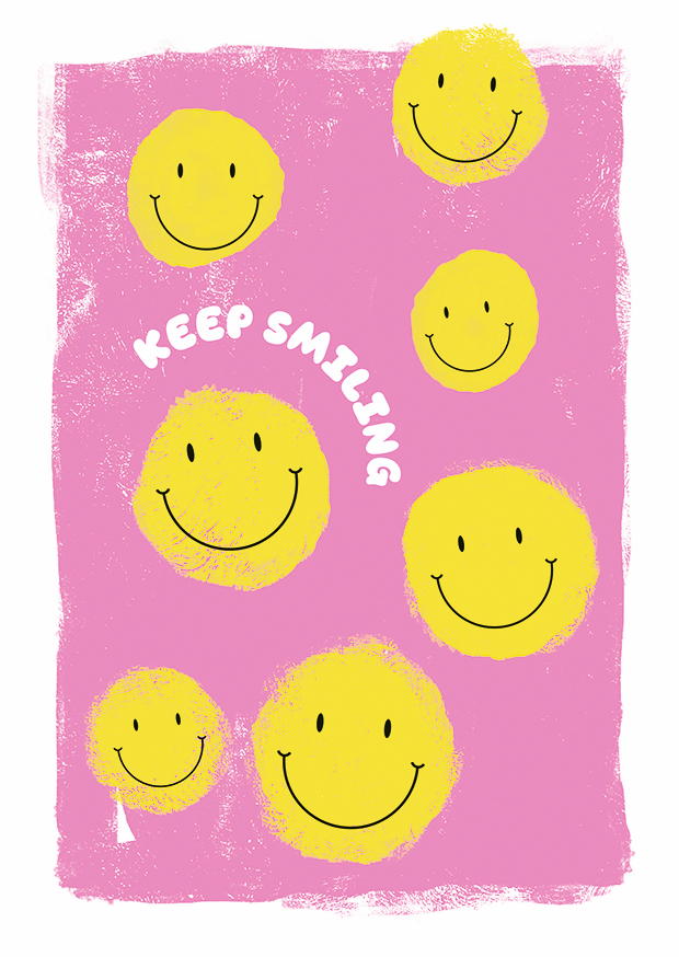 Auf einem pinken Hintergrund sind mehrere lächelnde Gelbschilder abgebildet, die fröhliche Stimmung verbreiten. Die Botschaft ermutigt dazu, optimistisch zu bleiben.