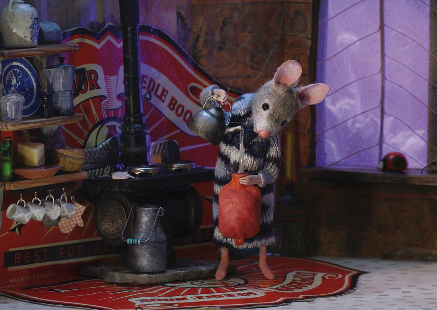 In einer einladenden Küche arbeitet eine Maus, gekleidet in einen gestrickten Morgenmantel, um ein Gericht zuzubereiten, während ein alter Herd im Hintergrund steht.