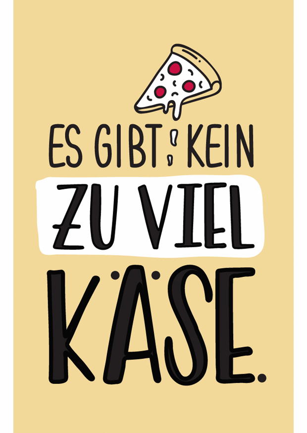 Ein kreatives Kunstwerk mit einer Pizza und dem Spruch, dass es kein zu viel Käse gibt. Der moderne, minimalistische Stil bringt gute Laune in jeden Raum.