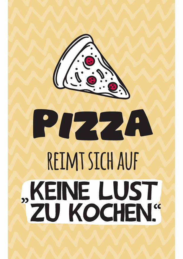 Ein humorvolles Plakat zeigt eine Pizza mit dem Spruch, dass Pizza sich reimt auf keine Lust zu kochen. Ideal für alle Pizza-Liebhaber ohne Kochmotivation.