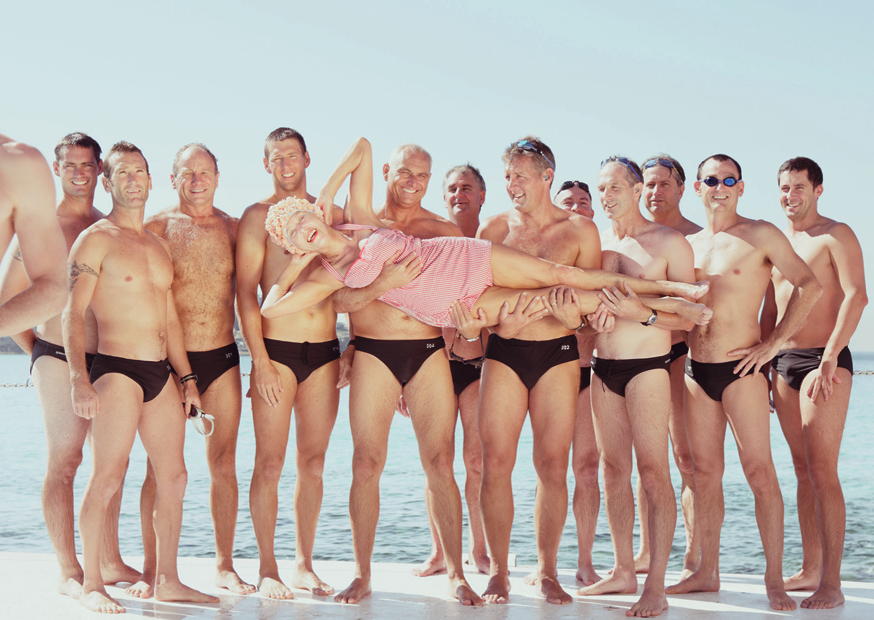 Eine fröhliche Frau in einem rosa Badeanzug wird von mehreren Männern am Strand gehalten. Die Szene zeigt eine freundliche Atmosphäre und Sonnenschein.
