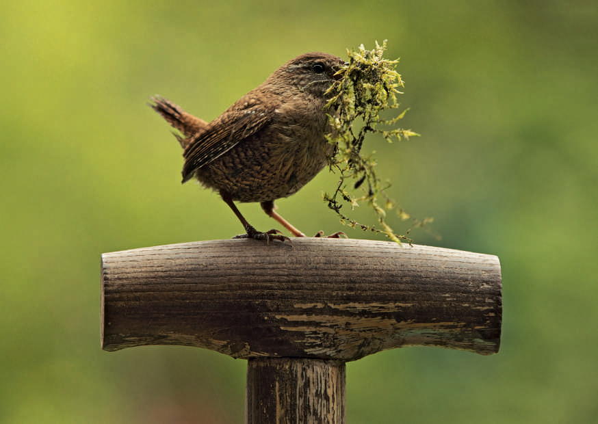 Ein kleiner Vogel sitzt auf einem Holzpfosten und sammelt Moos, um sein Nest im Garten zu bauen. Es ist Frühling und die Umgebung ist grün und lebendig.