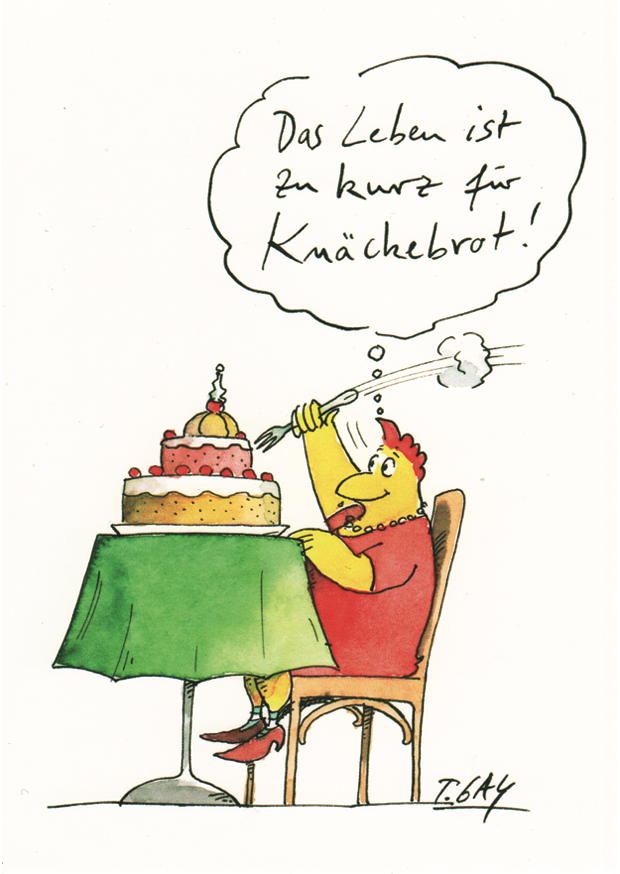 Ein fröhlicher Mann sitzt an einem Tisch und genießt ein Stück Kuchen mit einer Gabel. Über ihm schwebt ein Sprechblasenkommentar über das Leben.