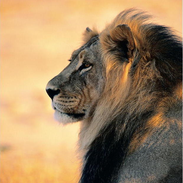 Der Löwe steht regungslos in der golden schimmernden Savanne und beobachtet aufmerksam die Umgebung, während die Sonne den Himmel färbt.