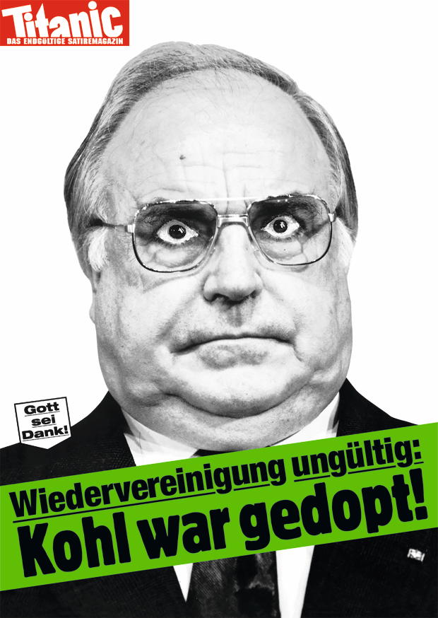 Der Ausdruck des Politikers zeigt Überraschung und Empörung über die politischen Entwicklungen in Deutschland. Die satirische Darstellung kritisiert die Wiedervereinigung und deren Wahrnehmung.