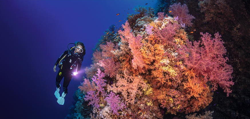 Eine Taucherin schwimmt an einem prächtigen Korallenriff vorbei, das in lebhaften Farben erstrahlt, während sie mit einer Taschenlampe Licht auf die Korallen wirft.