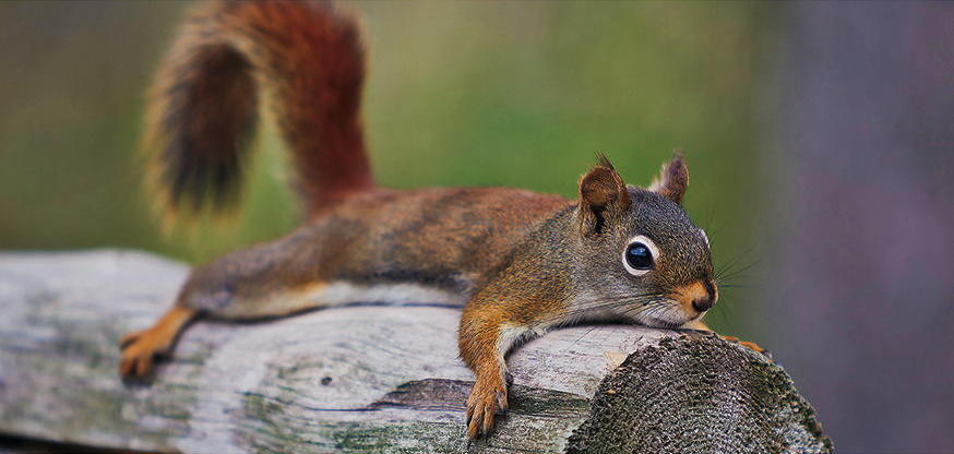 Ein Eichhörnchen liegt entspannt auf einem Baumstamm und genießt die Ruhe des Waldes. Die Morgenatmosphäre sorgt für eine friedliche Szenerie.