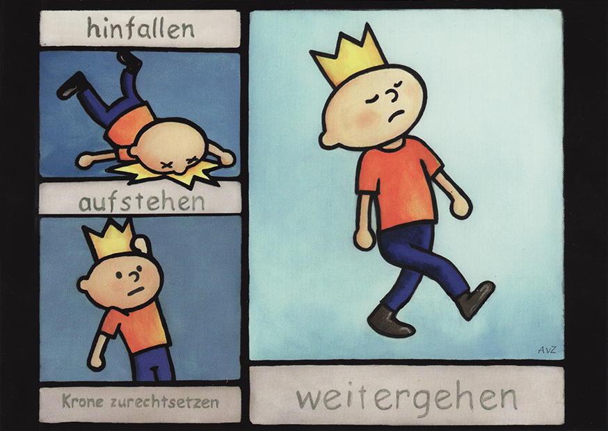 Ein kleiner König erlebt einen Rückschlag, fällt hin, steht tapfer wieder auf und richtet seine Krone, um seinen Weg fortzusetzen und Stärke zu zeigen.
