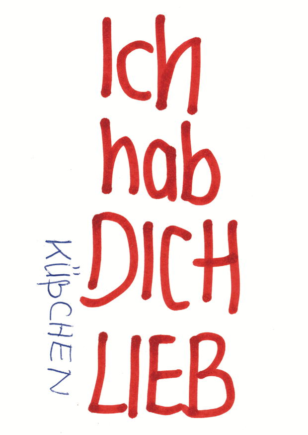 Auf einem weißen Hintergrund steht in großen roten Buchstaben die liebevolle Botschaft Ich hab dich lieb. Daneben ist das Wort Küpchen in blauer Tinte geschrieben.