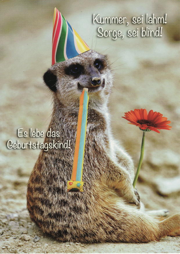 Ein Erdmännchen steht mit einer bunten Party-Hut auf dem Kopf. Es lächelt, während es eine kleine Blume hält und eine Geburtstagsfeier genießt.