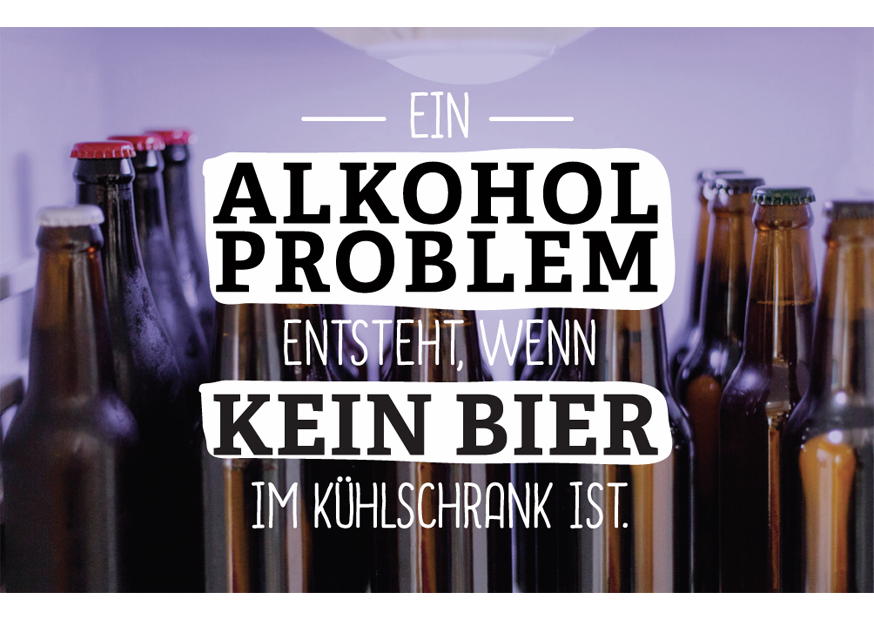 In einem Kühlschrank stehen viele Flaschen Bier. Der Schriftzug informiert über ein Alkohol Problem, wenn im Kühlschrank kein Bier vorhanden ist.