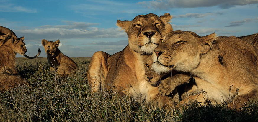 Eine Gruppe von Löwinnen ruht sich in der afrikanischen Savanne aus, umgeben von sanften Hügeln. Die Tiere zeigen fürsorgliches Verhalten gegenüber ihren Jungen.
