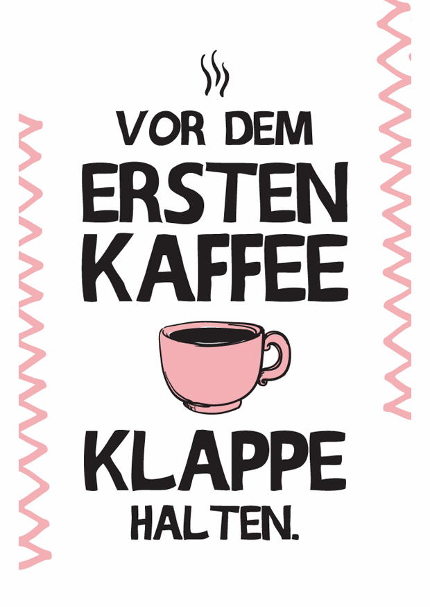 Das Motiv zeigt eine humorvolle Aufforderung, vor dem ersten Kaffee lieber still zu sein. Mit einer stilisierten Kaffeetasse und prägnanten Schriftzügen wird der Alltag humorvoll reflektiert.