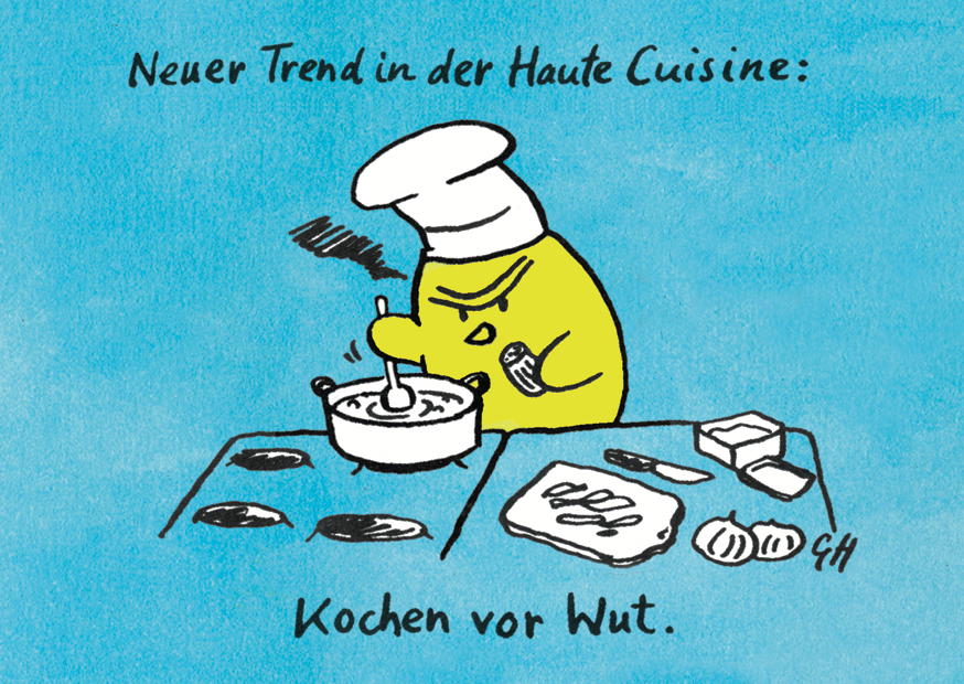 In einer humorvollen Illustration wird ein Koch gezeigt, der verärgert in einem Kochtopf rührt. Das Bild thematisiert kreatives Kochen als Ausdruck von Emotionen.