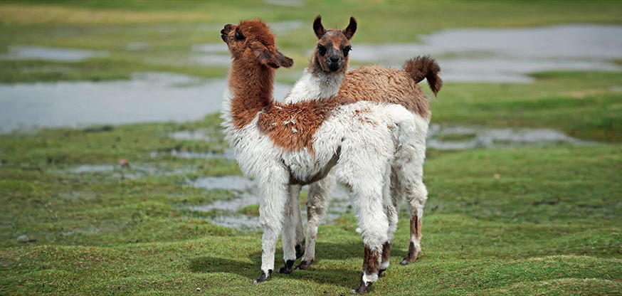Zwei Lamas stehen auf einer saftigen grünen Wiese in den Anden. Sie schauen aufmerksam in die Umgebung und genießen die ruhige Tagesatmosphäre.