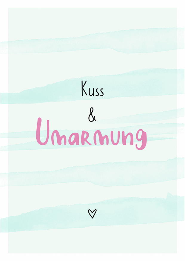 Das Design zeigt die liebevollen Worte Kuss & Umarmung in sanften Farben auf einem Hintergrund. Perfekt für Karten oder Dekorationen zu besonderen Anlässen.